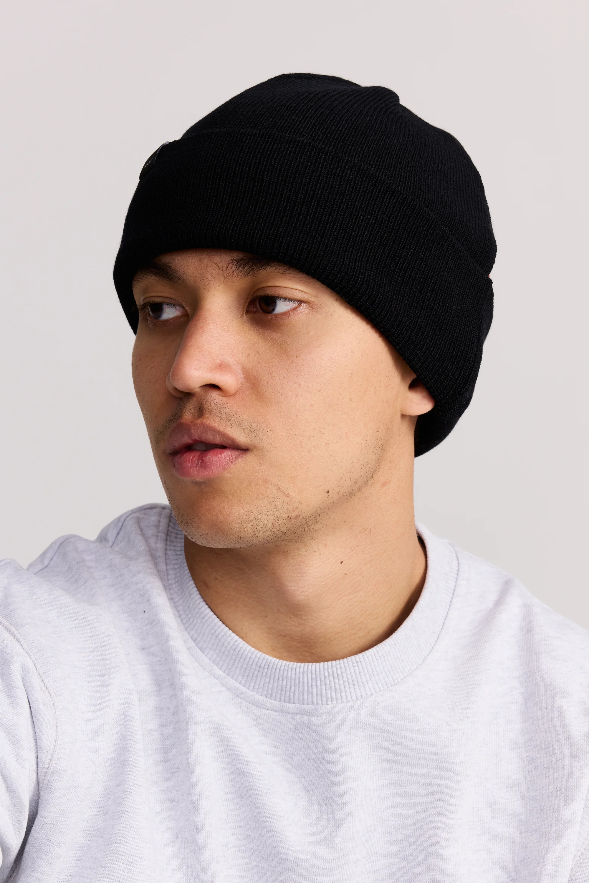 A Merino wool beanie with a Makia label on fold. Made in Finland.