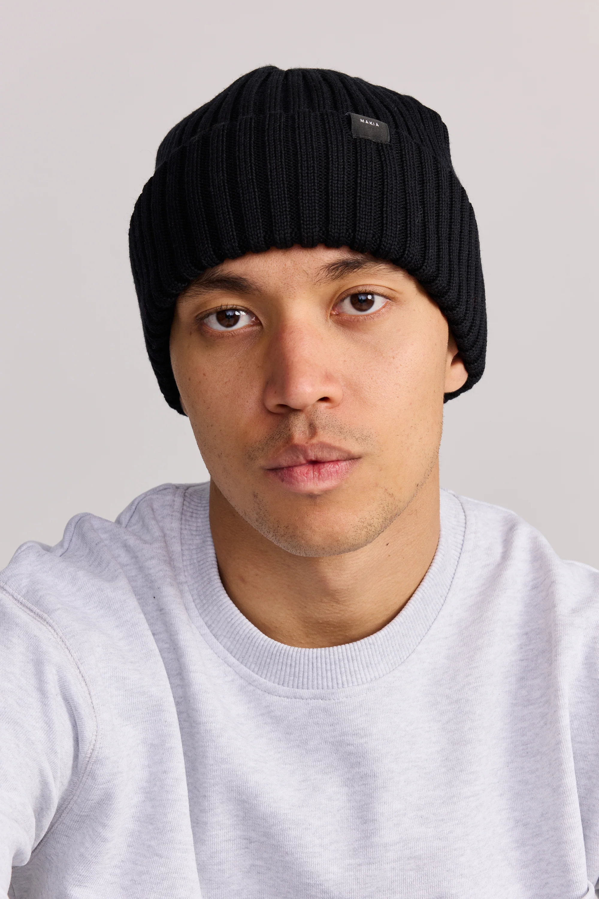 A merino wool beanie with a Makia label on the fold. The merino wool adjusts to different temperatures and keeps you going through the cold season.