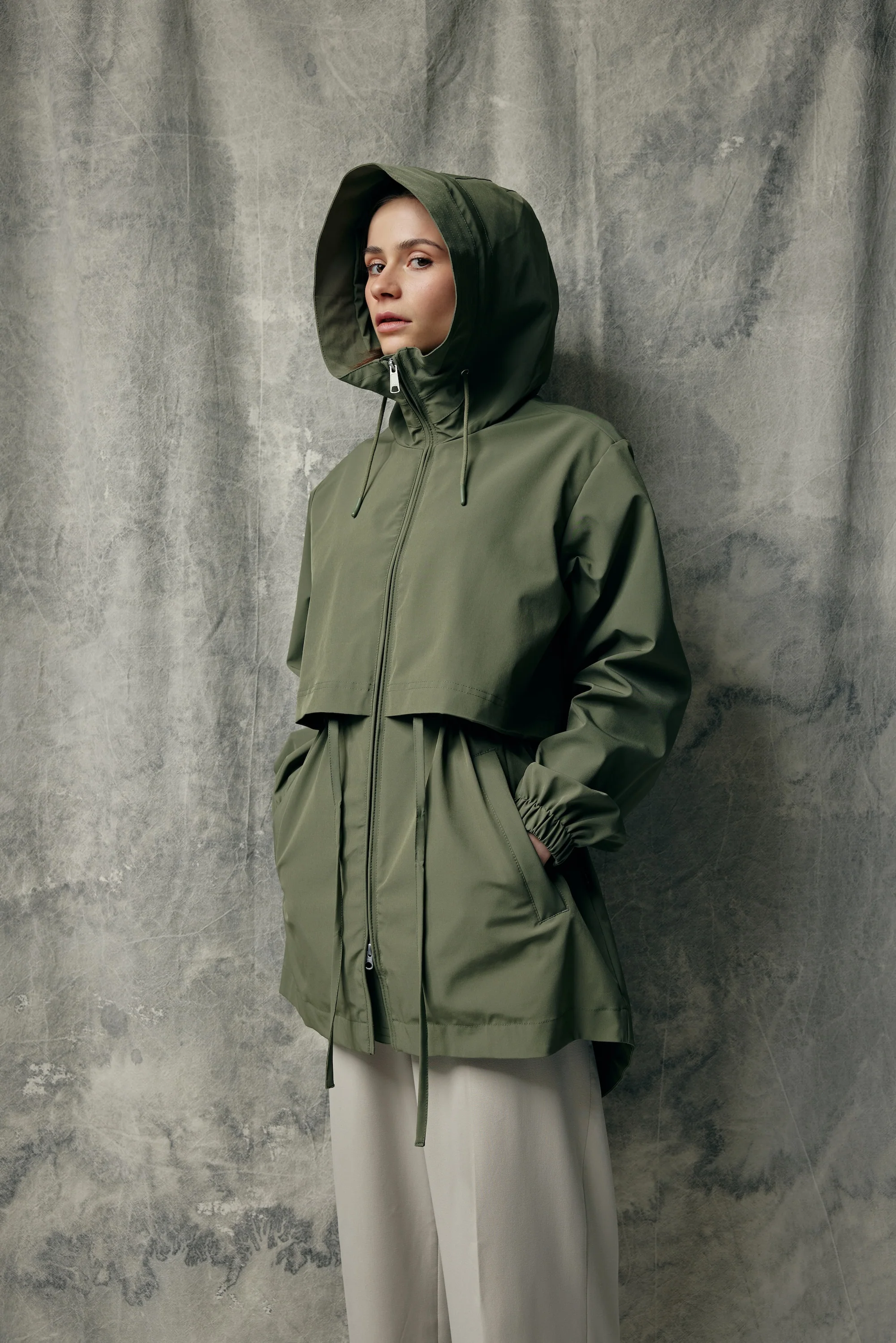 A relaxed-fitting coat with a classic Nordic design. The comfortable Kia Coat’s 100 % recycled polyester fabric is breathable and feels soft to the touch. Designed as an all-round coat for warmer weather, the coat has a slight stretch to it and a yoke detail with draw cords concealed underneath it. The 3000mm water column, critically taped seams, and snorkel hood provide protection from the soft summer showers.